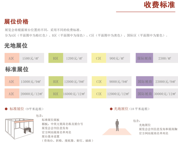 注:标准展位费用包括:3X3=9m2场地、楣牌制作、咨询台、折椅、废纸篓、插座一个、射灯;空地展位费用包括:展出场地、保安、清洁服务(不包含特装管理费)。