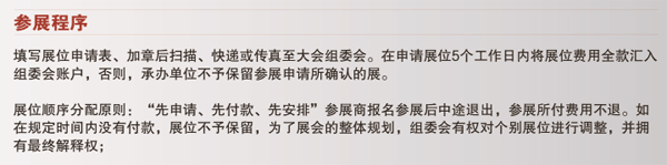填写展位申请表、加章后扫描或传真至大会组委会。在申请展位一周内将参展费用[50%订金或全款]电汇或交至组委会,展位顺序分配原则:“先申请、先汇款、先安排”,余款在2025年5月10日前付清。
