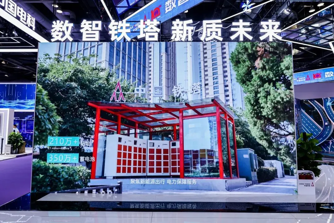 在9月25日开展的2024中国国际信息通信展的换电业务连线现场,外卖骑手正拿出电量不足的电池,用手机APP扫码更换满电电池。中国铁塔坚持共享发展理念,加快“一体两翼”战略布局,将通信基站的资源与电力保障能力向社会延伸,依托210万站址资源、能源设施,打造分布式电力网络、储能系统,向社会提供新能源出行、电力保障、综合能源等新能源服务,为群众提供全方位的惠民服务,助力经济社会绿色低碳转型。